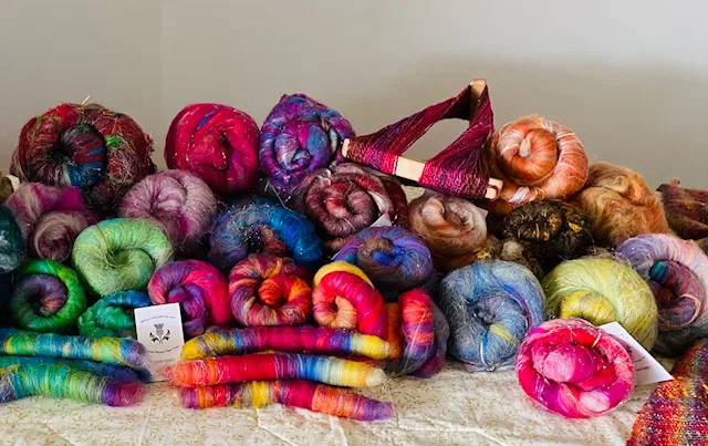 Hand Dyed and Spun Wool and Natural Fibres in Rolags and Art Batts.. Workshops in Spinning Weaving and Felting.